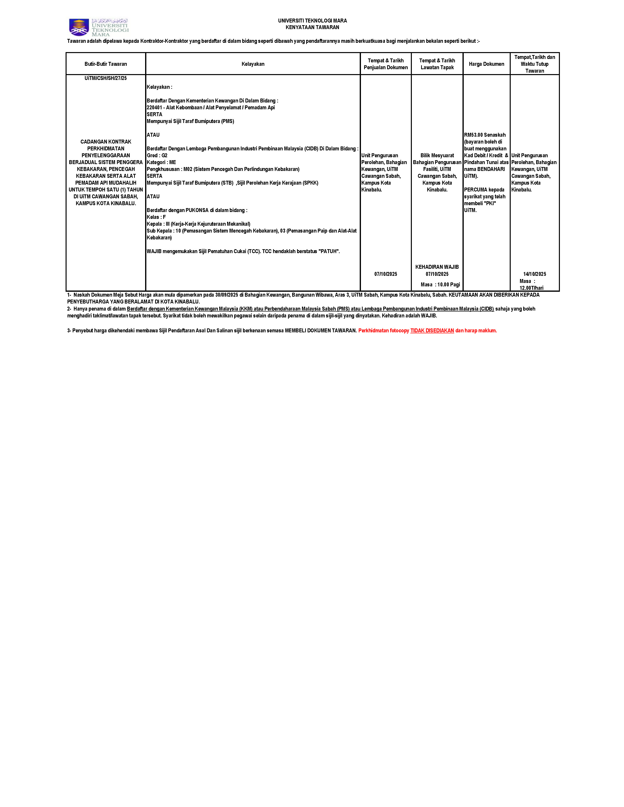 Articles 30 Sep,2025 Admin8 TERKINI @ UiTMCSH Hits: 46 IKLAN SEBUT HARGA: [UiTM/CSH/SH/27/25]: CADANGAN KONTRAK PERKHIDMATAN PENYELENGGARAAN BERJADUAL SISTEM PENGGERA KEBAKARAN, PENCEGAH KEBAKARAN SERTA ALAT PEMADAM API MUDAH ALIH UNTUK TEMPOH SATU (1) TAHUN DI UiTM CAWANGAN SABAH, KAMPUS KOTA KINABALU Print Prev Next