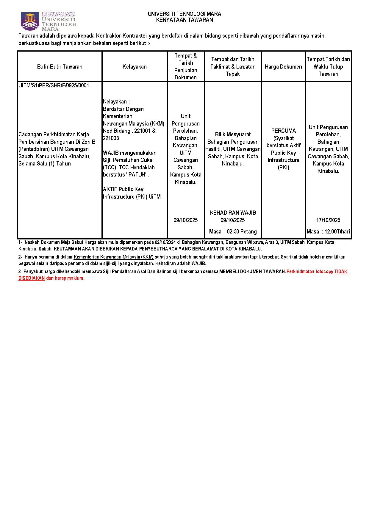 Articles 02 Oct,2025 Admin8 TERKINI @ UiTMCSH Hits: 27 IKLAN SEBUT HARGA: [UiTM/S1/PER/SHR/F/0925/0001]: Cadangan Perkhidmatan Kerja Pembersihan Bangunan Di Zon B (Pentadbiran) UiTM Cawangan Sabah, Kampus Kota Kinabalu, Selama Satu (1) Tahun Print Prev Next