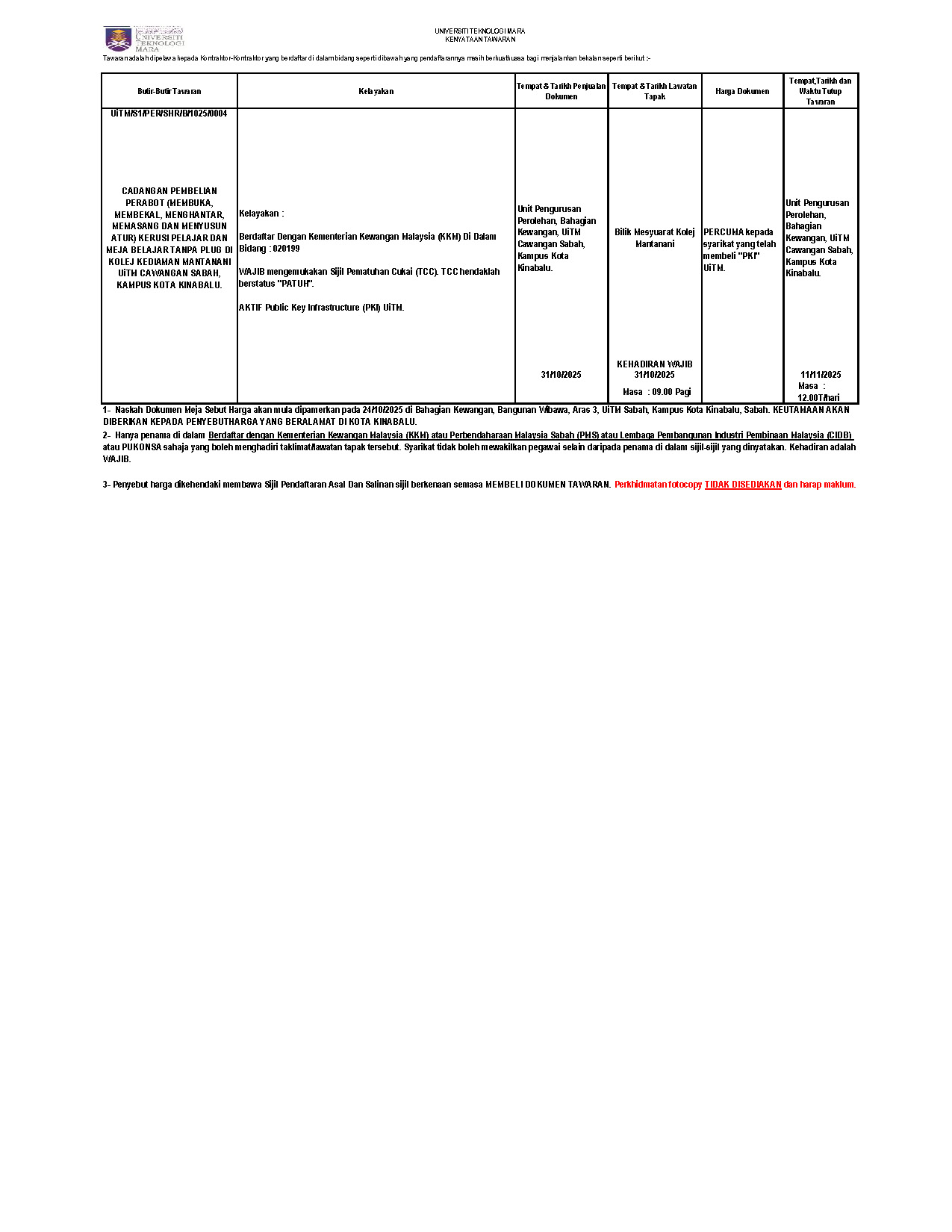 IKLAN SEBUT HARGA: [UiTM/S1/PER/SHR/B/1025/0004] : CADANGAN PEMBELIAN PERABOT (MEMBUKA, MEMBEKAL, MENGHANTAR, MEMASANG DAN MENYUSUN ATUR) KERUSI PELAJAR DAN MEJA BELAJAR TANPA PLUG DI KOLEJ KEDIAMAN MANTANANI UiTM CAWANGAN SABAH, KAMPUS KOTA KINABALU